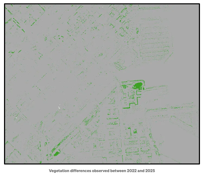 Finally, we can detect and visualize changes, such as those in vegetation, using the image below as an example: