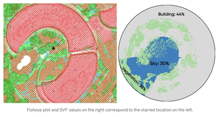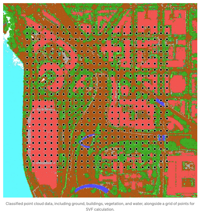 Measuring SVF takes more than just a weather app or a quick satellite snapshot, you need a detailed, 3D, street-level view of the city. That’s where LiDAR point cloud data shines, capturing billions of laser-scanned points from every rooftop, treetop, street, and sidewalk. This treasure trove of 3D data lets us model the urban canopy, the intricate layer of buildings and greenery that controls how sunlight and air flow through the cityscape. From this, we can calculate SVF and generate cool fisheye plots that show exactly how much sky you’d see lying anywhere on the ground.