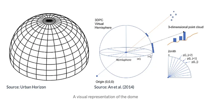 As you can see in the code above, some parts still rely on NumPy structures for operations like dome construction, plotting and SVF calculation. Since each grid point corresponds to a single dome, we can safely apply these NumPy-based functions on a per-row basis. To do this efficiently in PySpark , without too much code refactoring, I use the applyInPandas method. This allows us to apply our existing Pandas-based logic directly to each group of rows (grouped by the "fid" column) within the PySpark DataFrame. This way, we can leverage distributed processing in Spark while reusing existing, well-tested NumPy code for the dome and SVF calculations.